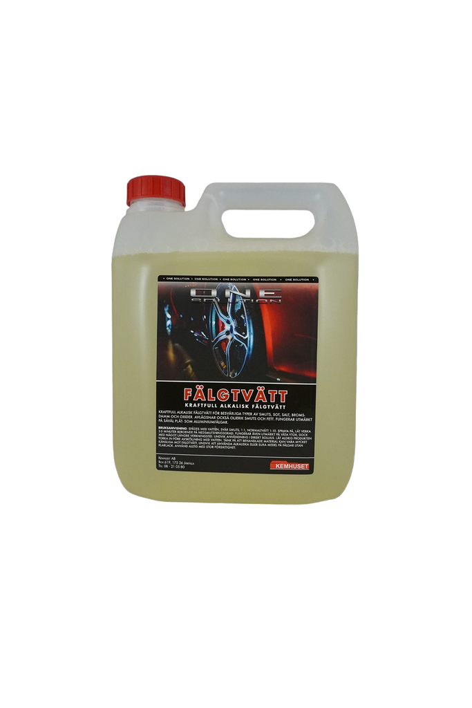 Kraftfull alkalisk fälgtvätt för besvärliga typer av smuts, sot, salt, bromsdamm och oxider. Avlägsnar också oljerik smuts och fett. Fungerar utmärkt på såväl plåt som aluminiumfälg. Fungerar utmärkt även på våta ytor. One Solution Fälgtvätt är en koncentrerad produkt och skall spädas med vatten.