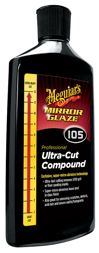 Meguiar's M105 Ultra Cut Compound är en grovrubbing som avverkar både mindre och större defekter. Fungerar lika bra med skumtrissa som med ull. Lämnar en häpnadsväckande glans och finish.